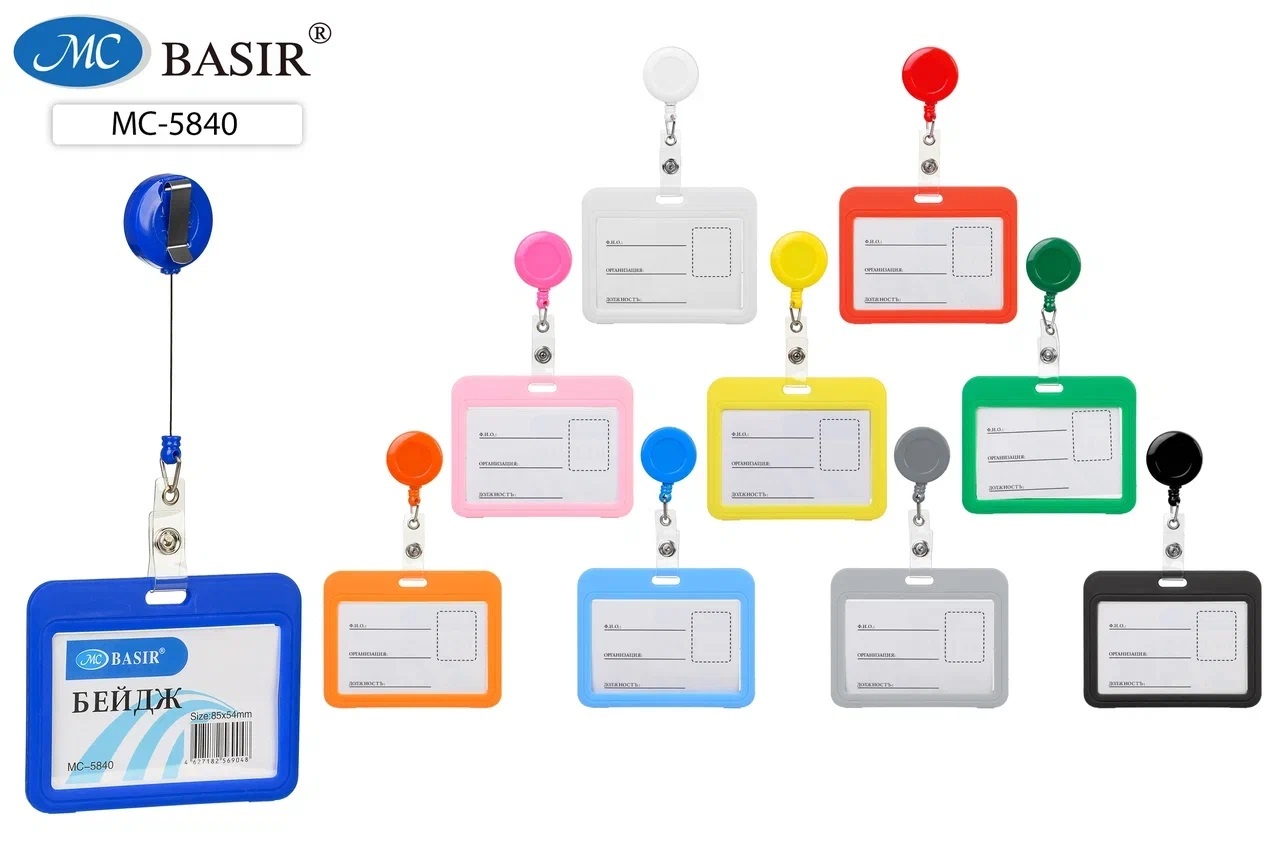 Бейджи для пропусков, проездных: горизонтальный, изготовлен из пластмассы, цветной /10 цветов/, с рулеткой-ретрактором с вытяжной нитью, размер 85*54 mm.