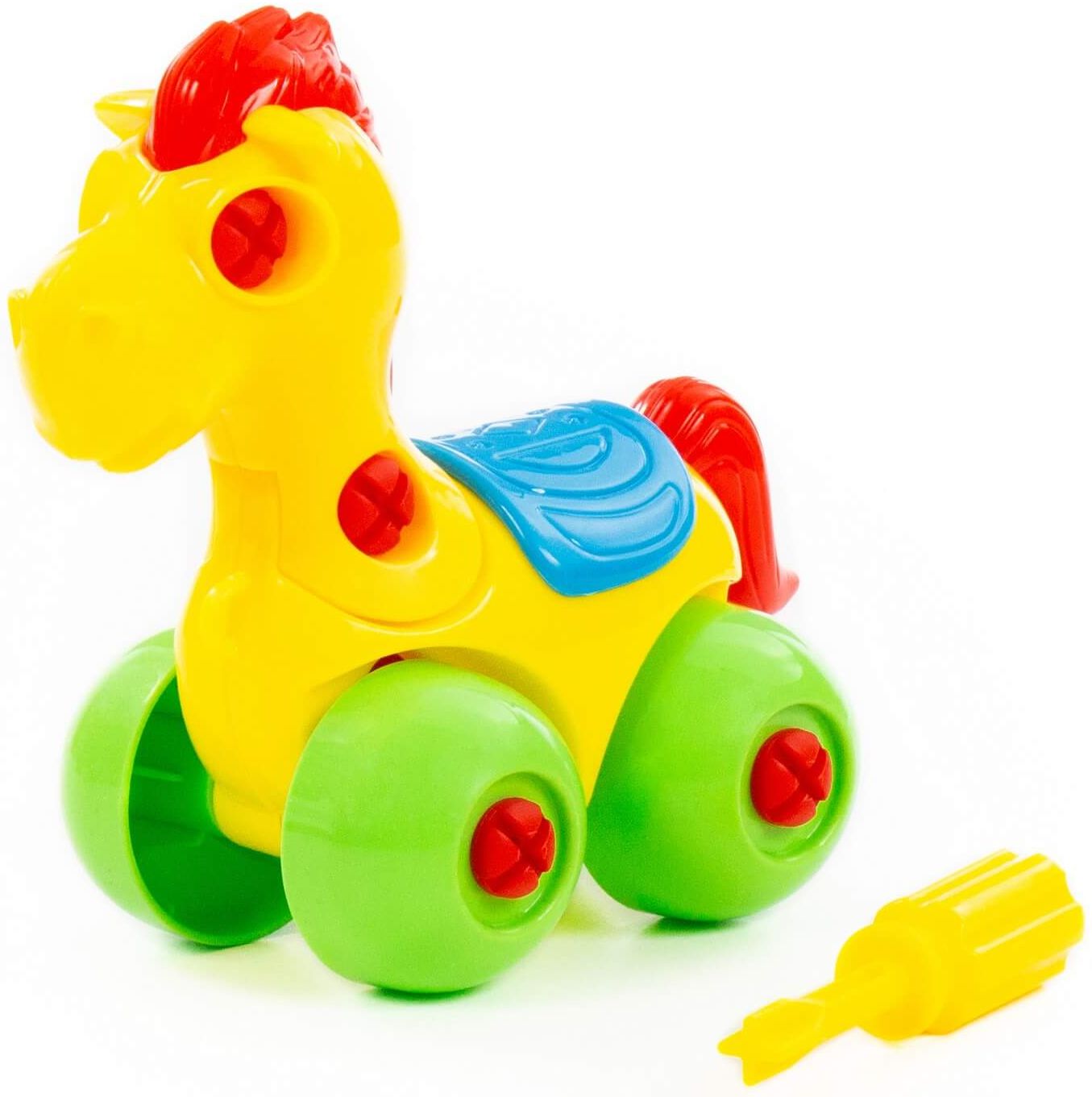 С помощью конструктора «Лошадка» ребёнок не просто знакомится с миром животных, а может многократно собирать и разбирать игрушку по элементам. Для этого в наборе предусмотрена специальная отвёртка. Игрушка на колёсах, поэтому ей можно играть как машинкой. Такой конструктор прекрасно подходит для воспитания малыша. С ним ребёнок изучает цвета и формы, у него развиваются усидчивость, логическое мышление, мелкая моторика рук и координация движений.