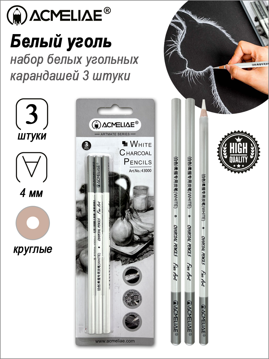 Набор высококачественных художественных угольных карандашей 3 штуки. Белый уголь для рисования сочетает лучшие характеристики угля и простых карандашей для творчества. Универсальный, обладают огромными возможностями в передаче света и тени. Удобен для проработки контуров и мелких деталей, скетчинга, эскизов, набросков, графики, портретов, живописи. Используются для смягчения и осветления основного цвета, создания монохромных рисунков, придания объема предметам за счет бликов, создания плавных цветовых переходов с помощью растушевки цвета. Помогает прорисовать светлые места, уменьшить насыщенность базовых цветов. Отлично смотрятся на темном фоне. Легко удаляется с бумаги ластиком. Подходят начинающим и профессиональным художникам, детям, школьникам, любителям рисования. Для студий и художественных школ. Корпус из натуральной древесины. Грифель - ударопрочный, с натуральным составом, мягко рисует по бумаге. Затачивается канцелярским ножом. Не пачкает руки. Корпус: круглый. Упаковка: блистер.