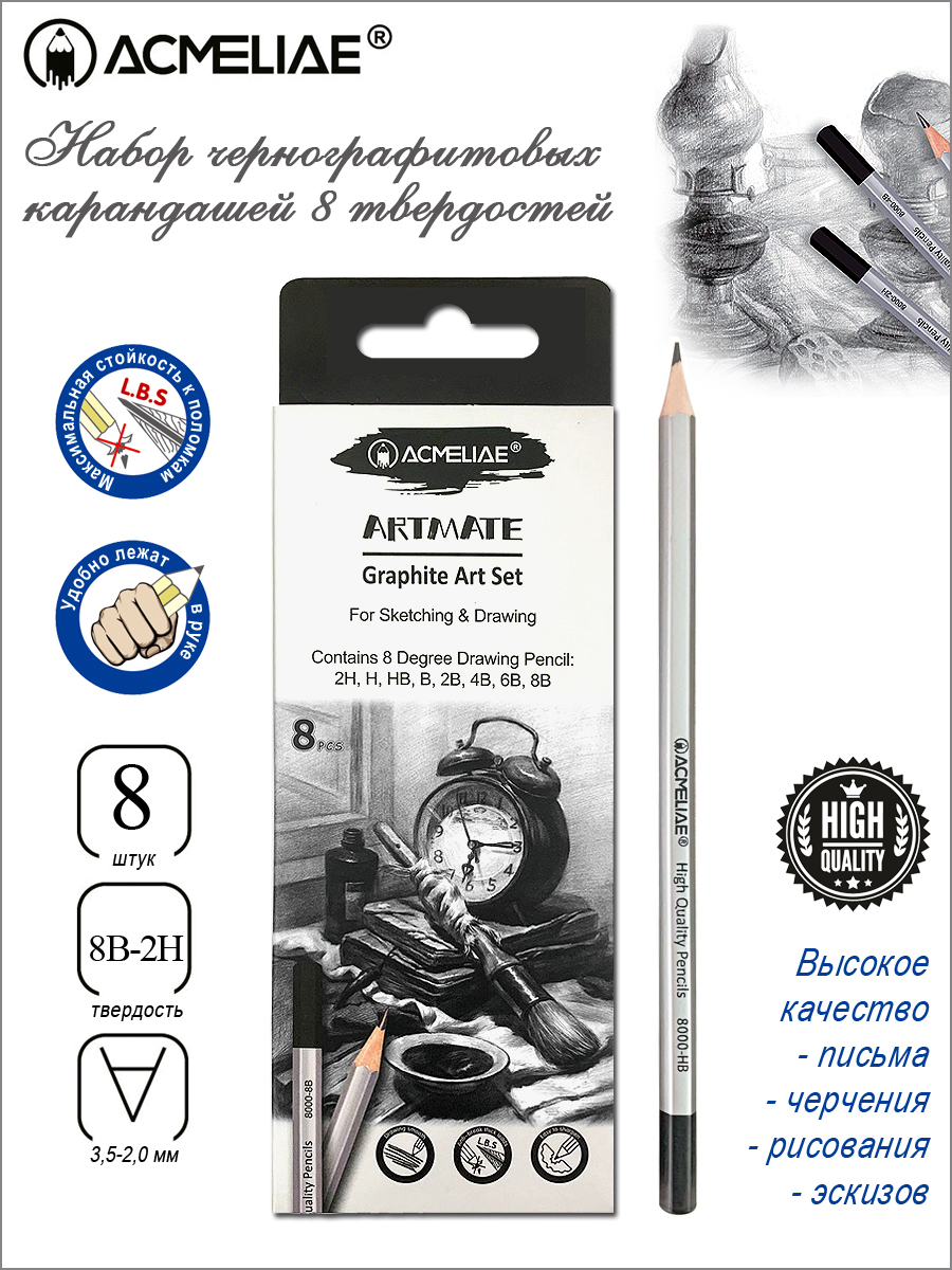 Набор чернографитных карандашей ACMELIAE 6 твердостей (2H,HB,2B,4B,6B,8B). Подходит для студентов вузов, инженеров, художников, архитекторов, чертежников, дизайнеров, художественных студий, школ, колледжей, школьников.