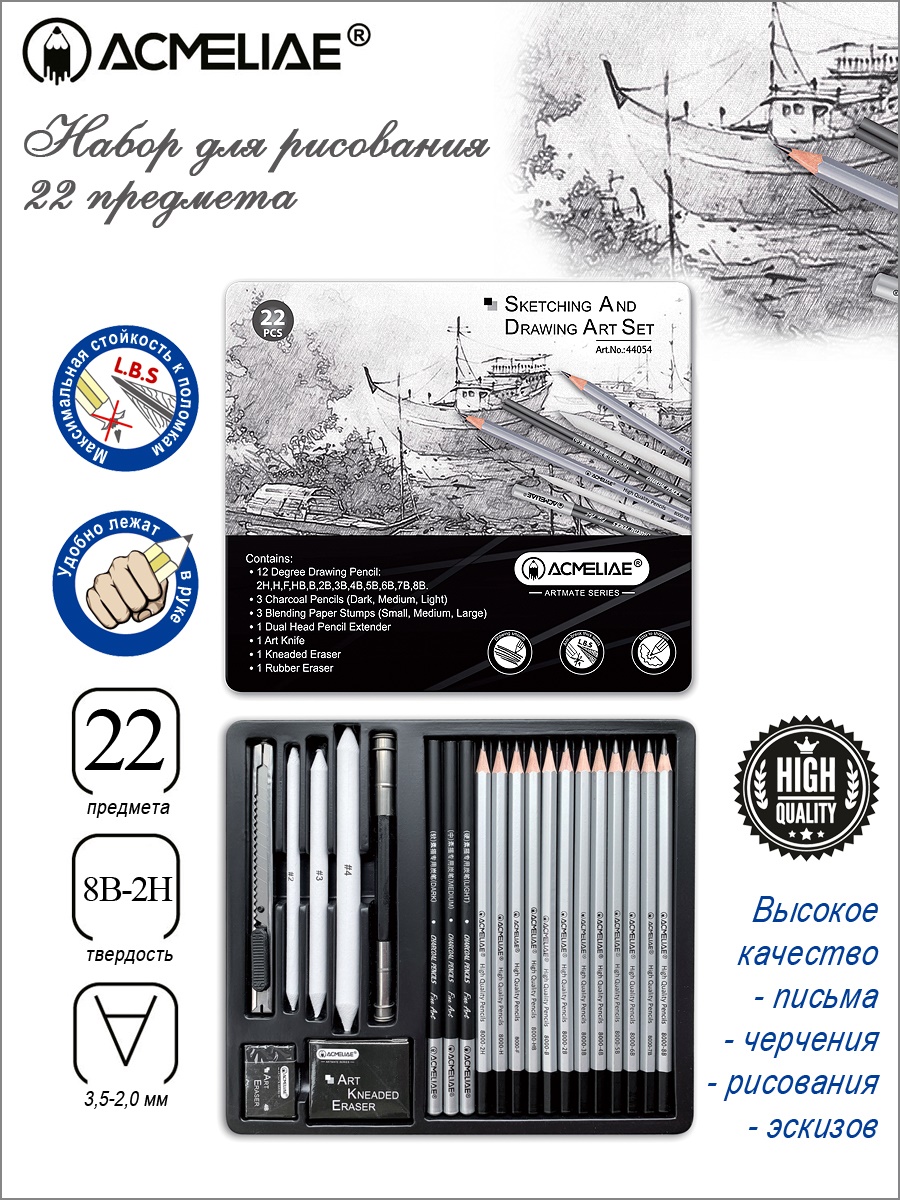 Набор для рисования 22 предмета. Включает: 12 карандашей твердости 2H,H,F,HB,B,2B,3B,4B,5B,6B,7B,8B 3 угольных карандаша (темный, средний, светлый) 3 растушевки (маленькая, средняя, большая) 1 держатель (удлинитель) для карандашей двусторонний 1 ластик-клячка 1 ластик 1 нож Высокое качество рисования, эскизов, набросков, скетчей, чертежей любой сложности. Профессиональный проклейка грифеля предотвращает его поломки при падении и затачивании. Однородный грифель карандаша не царапает бумагу, оставляет четкие яркие линии, не крошится, затачивается до нужной остроты. Шестигранный корпус легкий, удобно лежит в руке, ровно затачивается стандартными точилками, не меняет цвет, упругость. Длина корпуса 178мм. Диаметр грифеля 2,2мм. Матовая бархатистая лакированная поверхность, запаянный верх. Художественные профессиональные карандаши подойдут для студентов вузов, художников, архитекторов, дизайнеров, художественных студий, школ, колледжей.