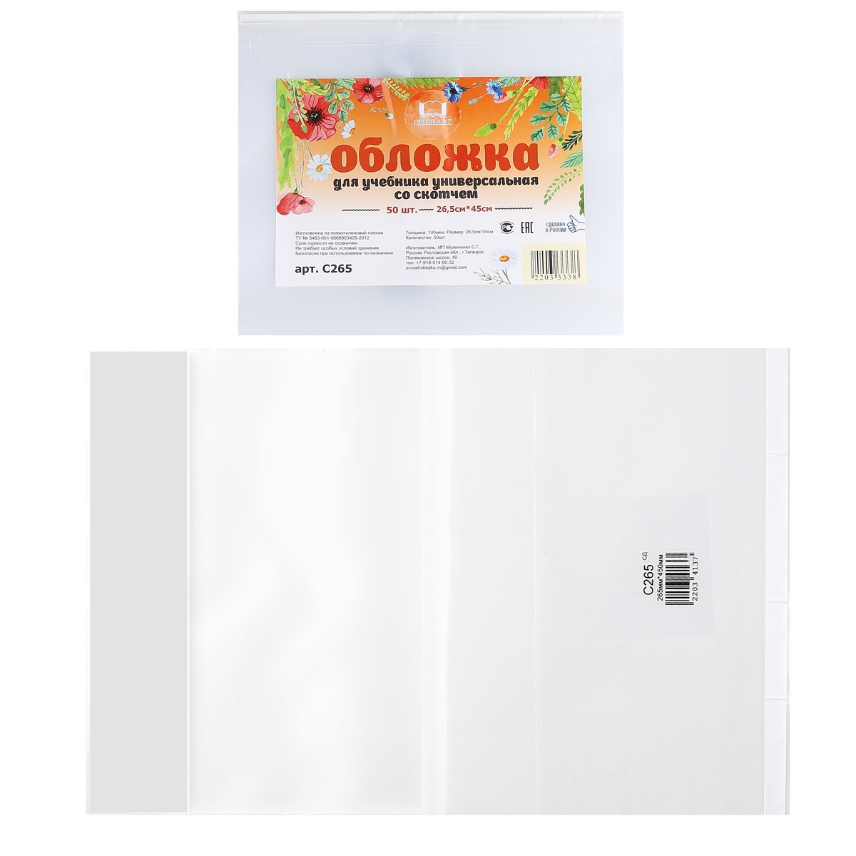 Обложки универсальные с клейким клапаном. Материал изготовления- полиэтиленовая пленка (ПЭ)- не имеет запаха, соответствует требованиям к безопасности товаров детского ассортимента (СанПиН 2.4.7/1.1.2651-10), плотность пленки 100 мкм.
